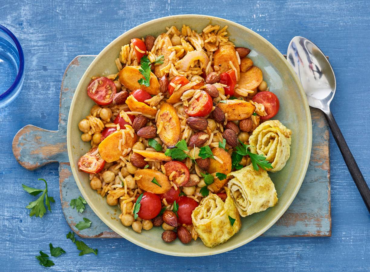 5. Schep de wortel en de rest van de tomaten door de rijst, breng op smaak met peper en eventueel zout. Verdeel over de borden en garneer met de peterselie en rookamandelen. Serveer met de omeletrolletjes.