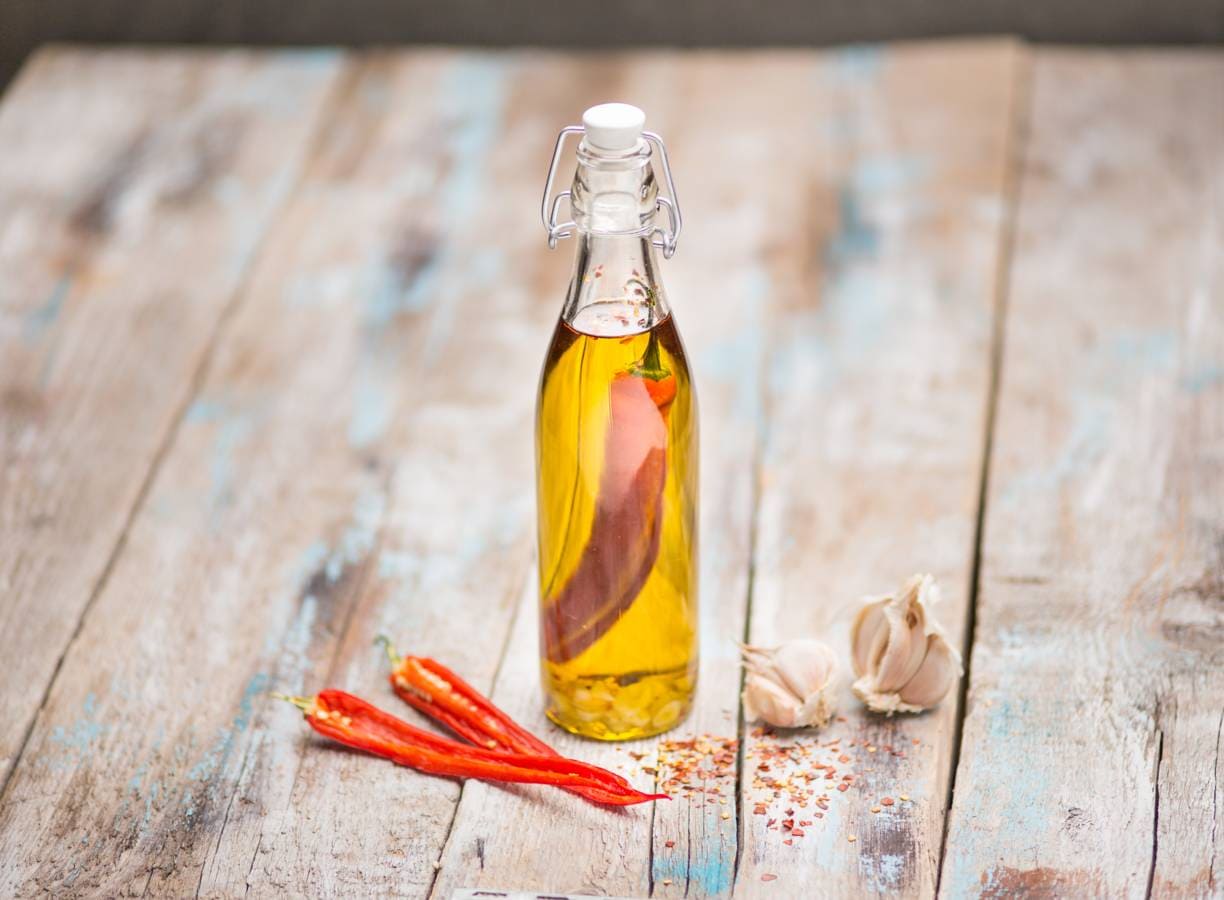 Snijd de tenen knoflook in dunne plakjes en voeg samen met de chilivlokken toe. Verwarm op laag vuur (niet koken) en giet terug in de fles of in een weckpot en laat 2 uur staan. Daarna wordt de smaak intenser.