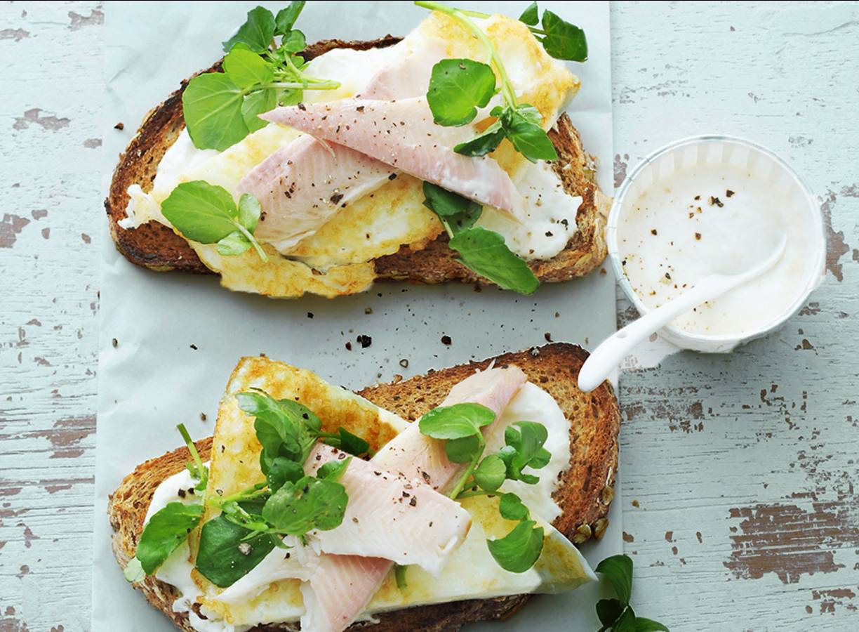 Roer ondertussen de kwark los met de mierikswortel. Breng op smaak met peper en eventueel zout. Snijd de forel in stukjes. Rooster het brood en snijd de omeletten doormidden. Verdeel de kwark, omelet, forel en waterkers over de sneetjes brood. Breng op smaak met peper en eventueel zout.