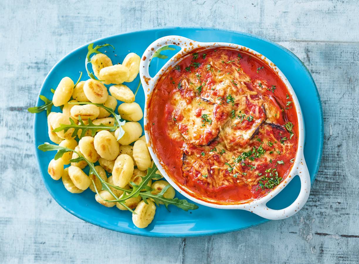Snijd de blaadjes van de peterselie fijn en bestrooi de aubergine al formaggio ermee. Serveer met de gnocchi.