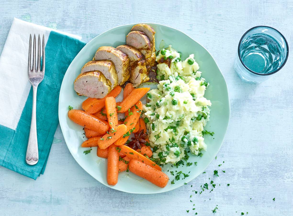 Gekruide varkenshaas met puree en honingworteltjes