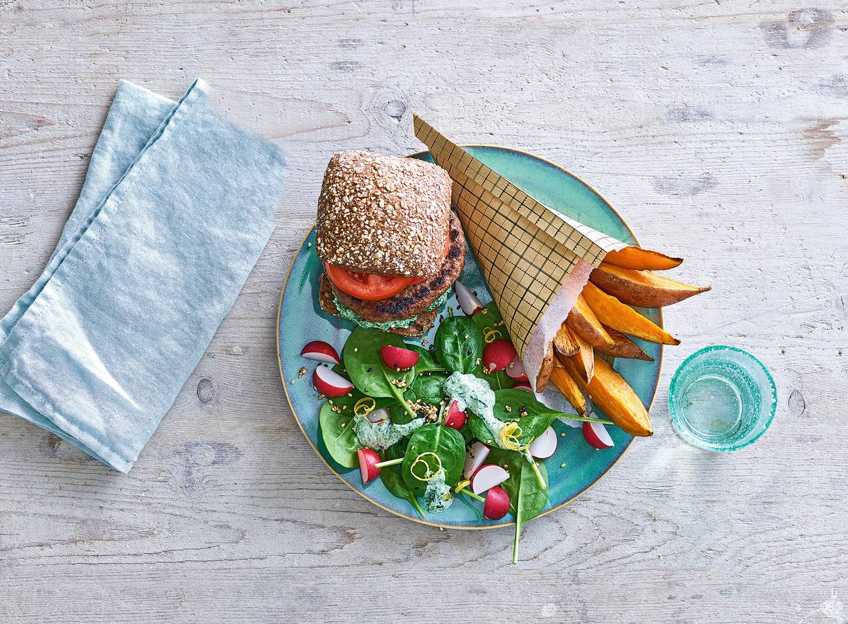 Hamburger met spinaziesalade en zoete-aardappelfrites