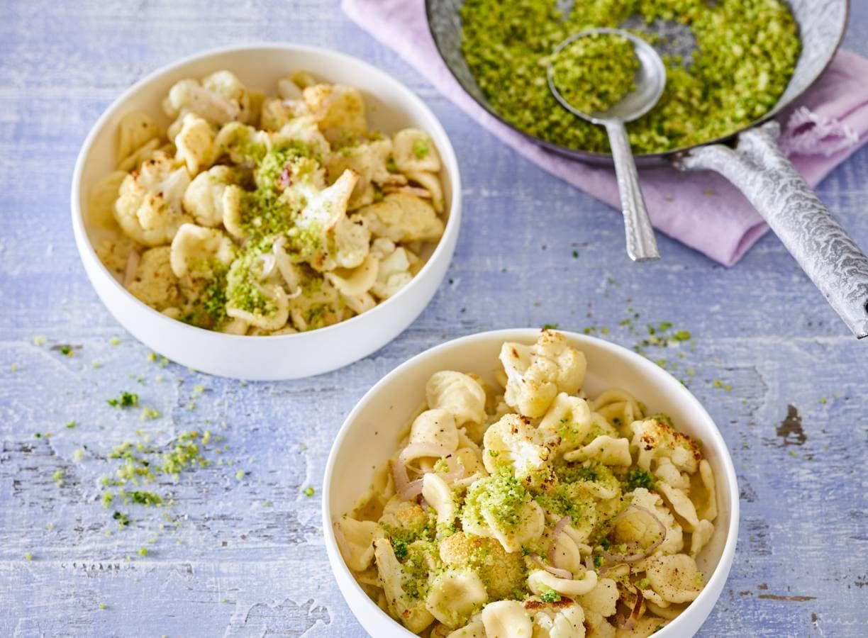Meng de geroosterde bloemkool met de rest van de olie door de pasta en verdeel het broodkruim erover.