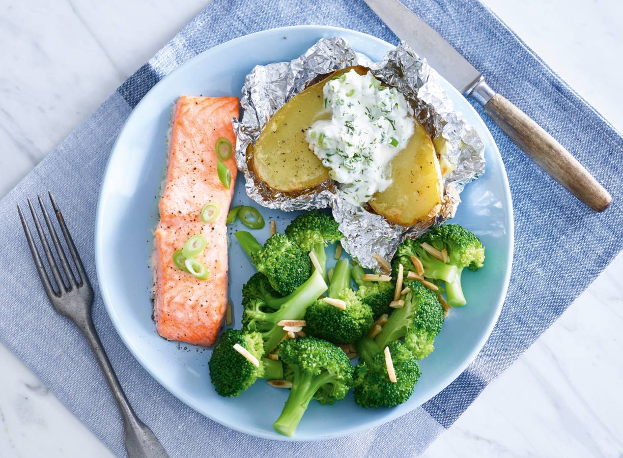 Gebakken zalm met perfecte pofaardappel en dille-yoghurtsaus