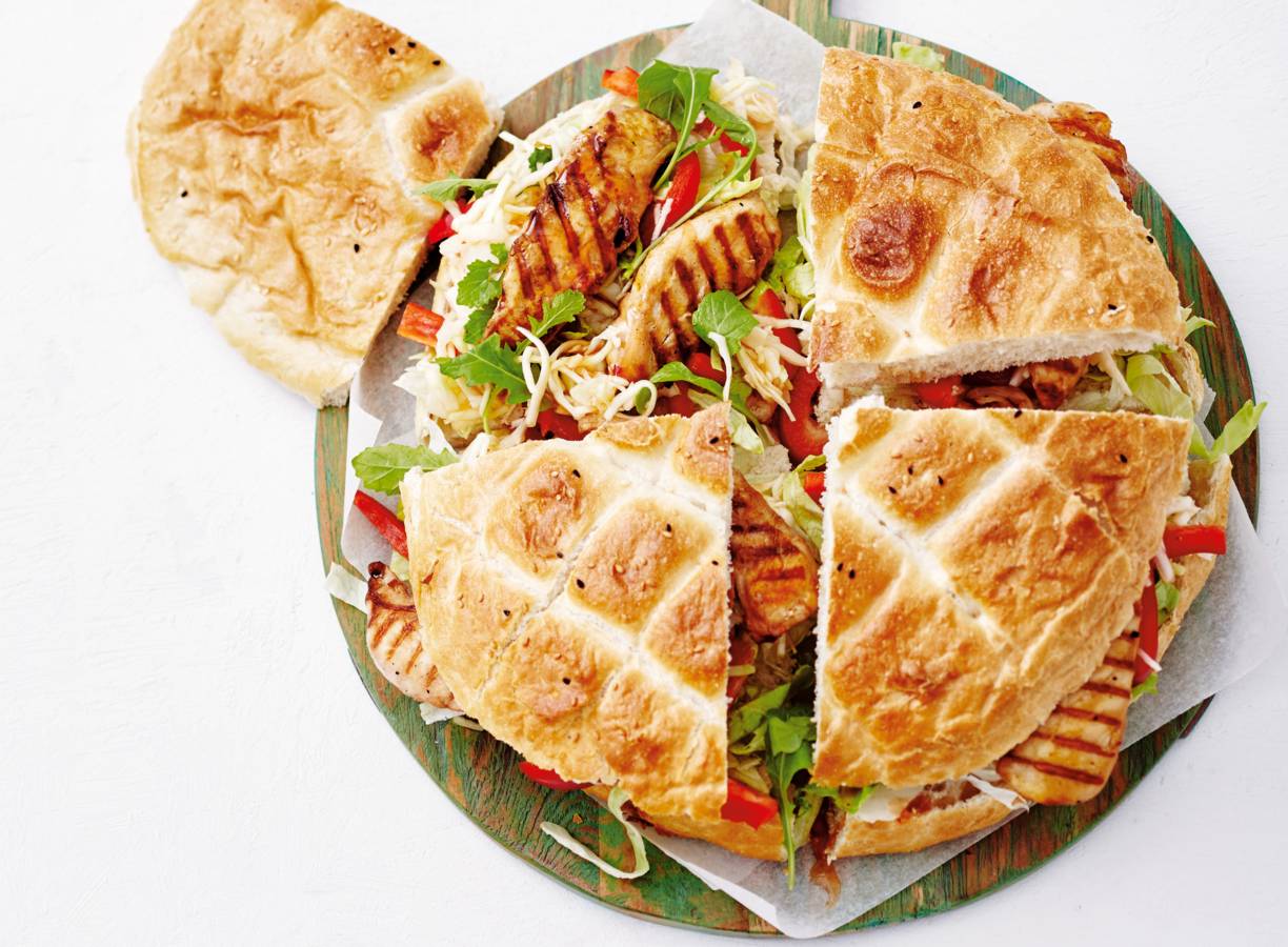 Neem de kip uit de pan en schep om met de rest van de chilisaus. Halveer het brood overlangs en verdeel de salade en kip erover. Snijd het brood in 4 parten en serveer direct.