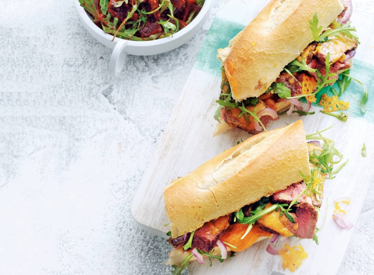 Neem uit de oven, besmeer de bovenste helft van het stokbrood met de rest van de mosterd. Beleg de onderste helft van het brood met de rest van de rucola, dek af met de bovenste helft en snijd in gelijke stukken. Serveer direct met de bietensalade ernaast.