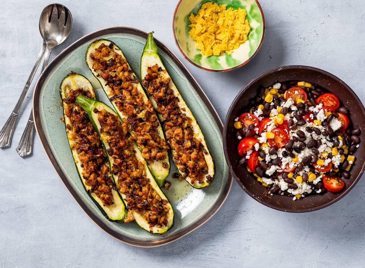 Leg de courgettehelften in de ovenschaal, vul ze met het gehaktmengsel en bak ze in ca. 25 min. gaar in de oven.