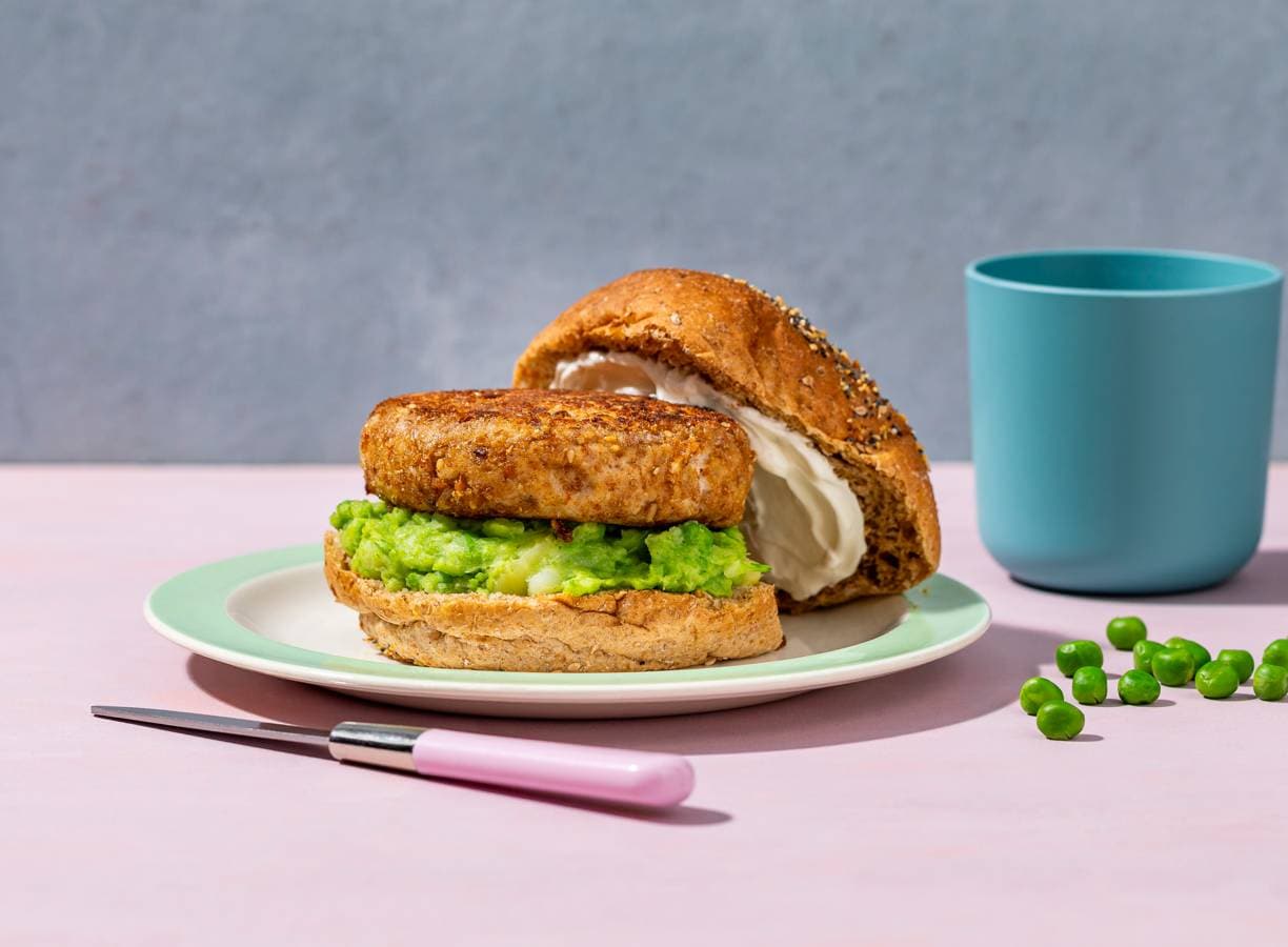 Giet de aardappelen en tuinerwten af. Stamp de aardappelen en de erwten met de melk tot een grove puree. Breng op smaak met peper. Snijd de broodjes open en beleg met de erwtenpuree en visburger.
