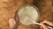 Klop ondertussen de eieren in een diep bord los met de melk en kaneelsuiker.