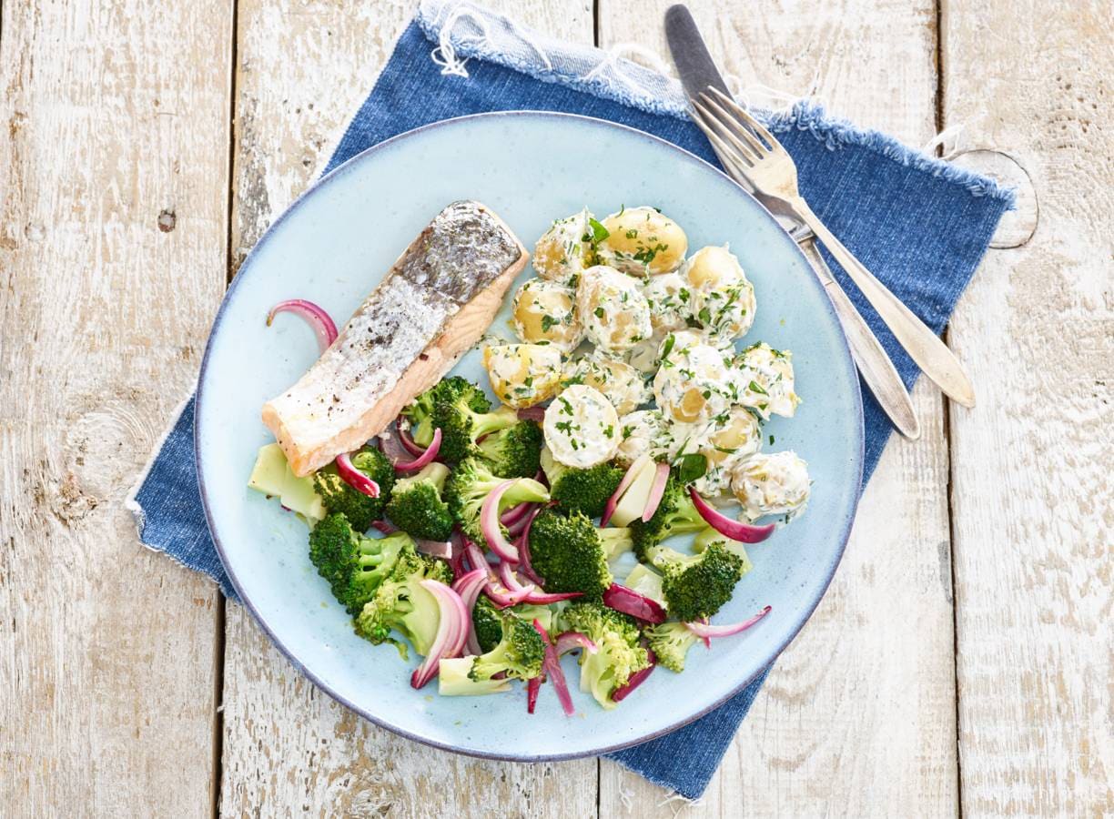 Zalm met romige aardappelsalade en broccoli