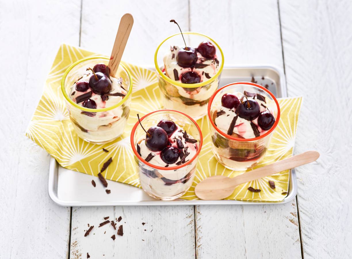 Breek de lange vingers doormidden. Doop de helft in het resterende kersenkookvocht en bedek de bodem van de glazen ermee. Verdeel de helft van het mascarponemengsel erover en daarna de helft van de kersen. Doop de overige lange vingers in het kookvocht en maak zo nog een laag met de koekjes, de rest van het mascarponemengsel en de rest van de kersen.