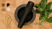 Doe de gerookte-paprikapoeder, peperkorrels, chiliflakes, het venkelzaad en de saffraan in de vijzel en wrijf fijn.