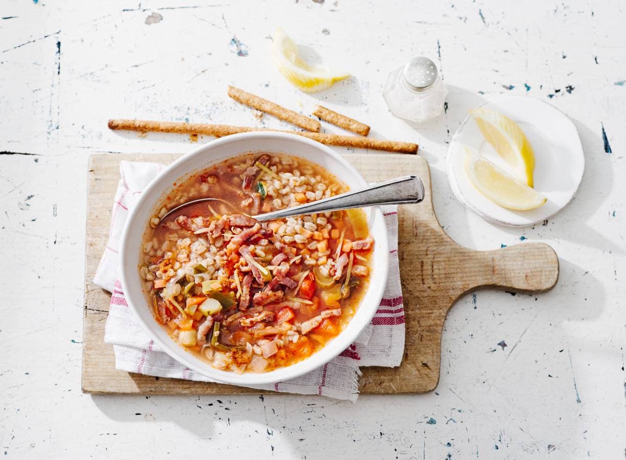 De bekende Italiaanse soep in een nieuw jasje met spelt en spekreepjes.