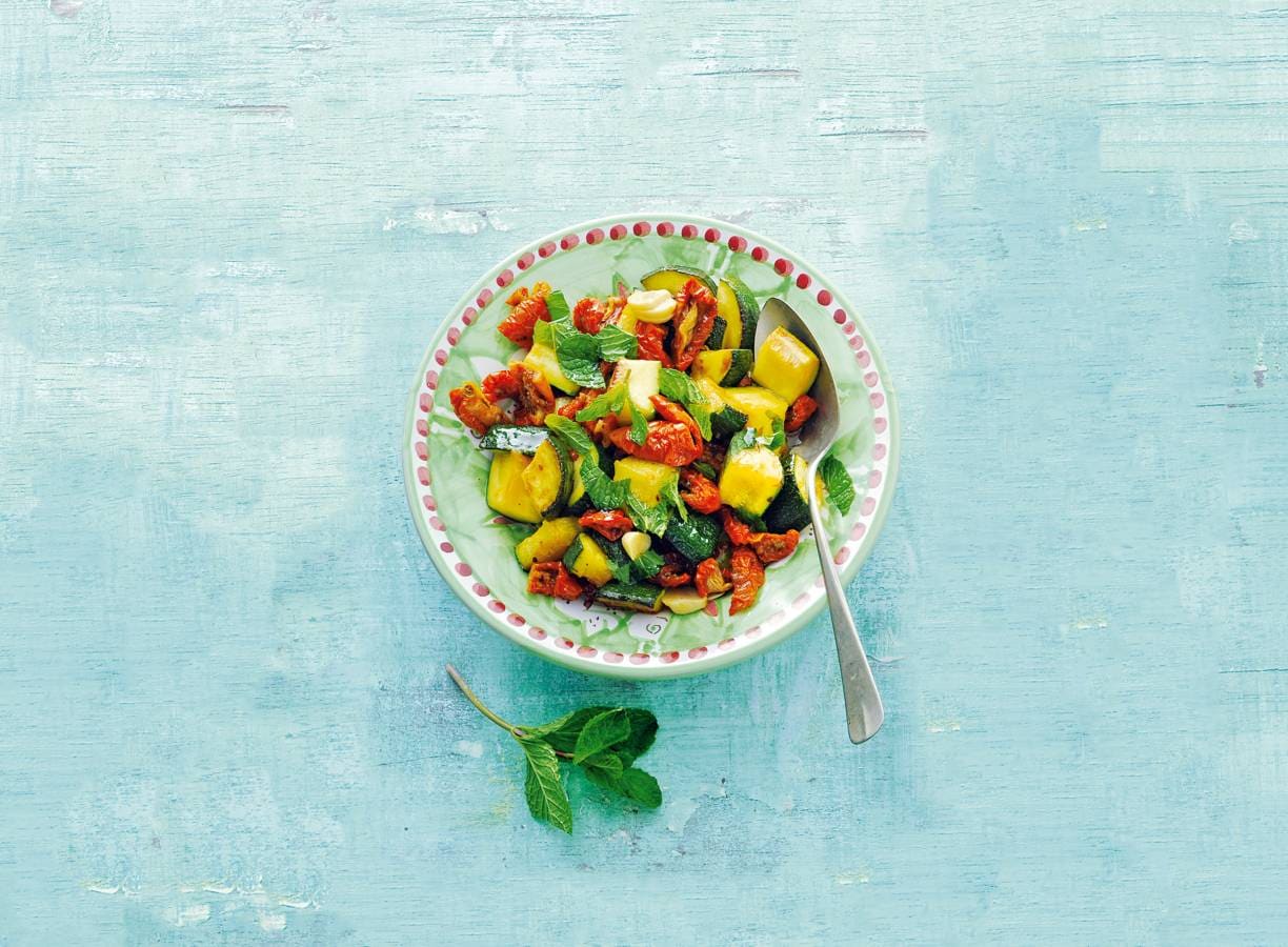 Courgette op een hele andere manier dan je 'm kent: met zongedroogde tomaatjes en balsamicoazijn.