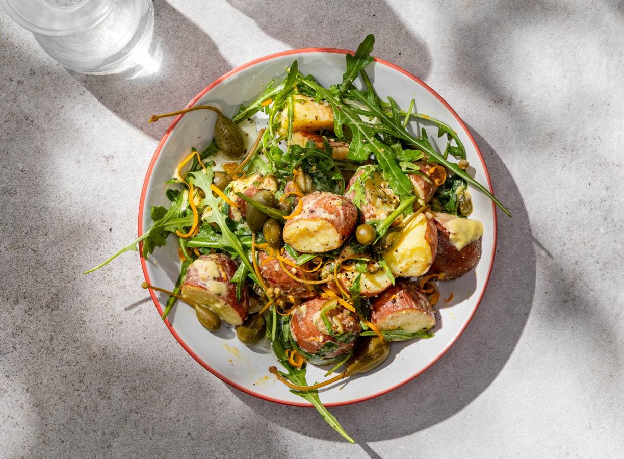 Altijd een topper voor bij de BBQ: aardappelsalade. Dit keer in een ander jasje, want je maakt de salade van rouge aardappelen. Serveer met sinaasappeldressing en kapperappeltjes. Enjoy!