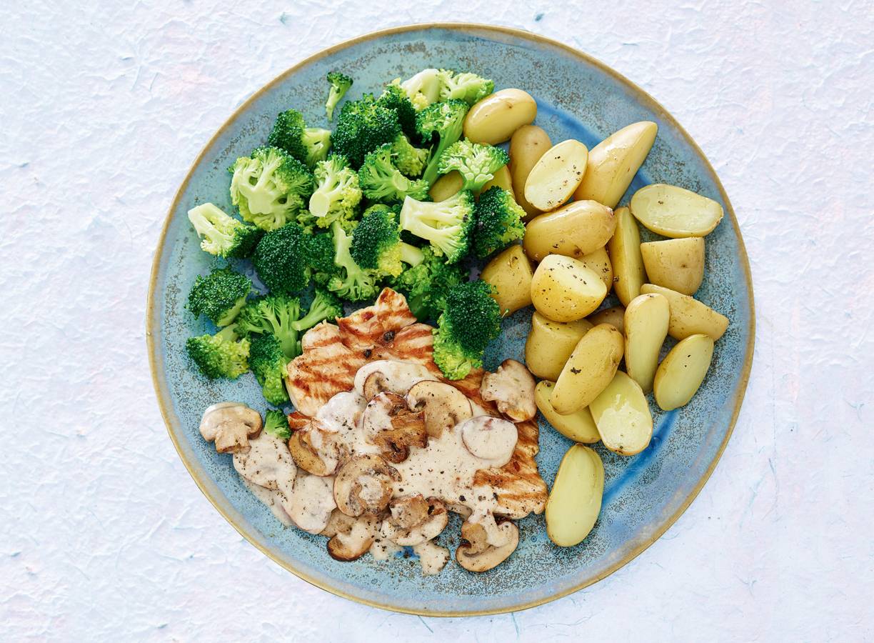 Breng ondertussen een pan water met eventueel zout aan de kook en kook de broccoli 5 min. Giet af. Serveer de kalkoenfilet met de champignonroomsaus, krieltjes en broccoli.