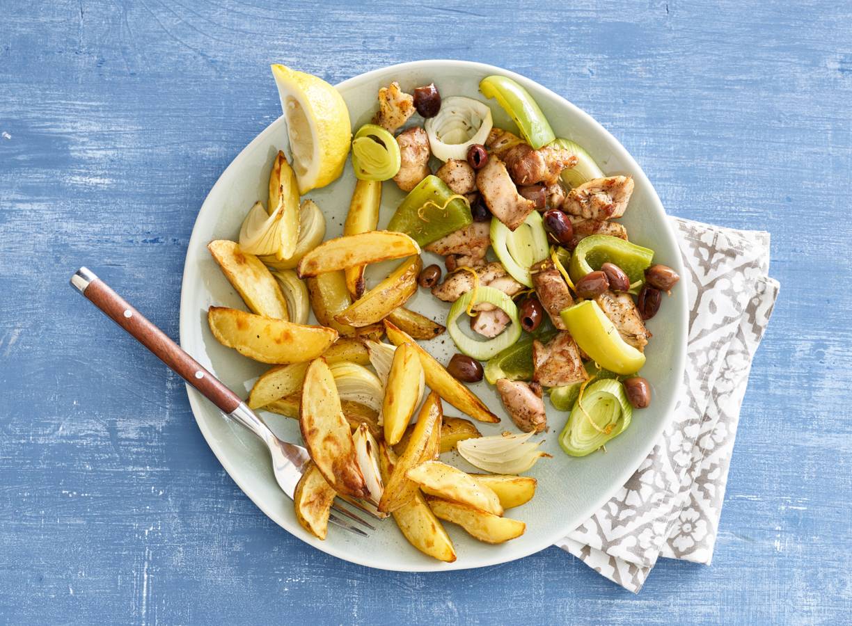 Verdeel de aardappelpartjes, groenten en kip over de borden. Verdeel de olijven erover en leg er een citroenpartje bij.