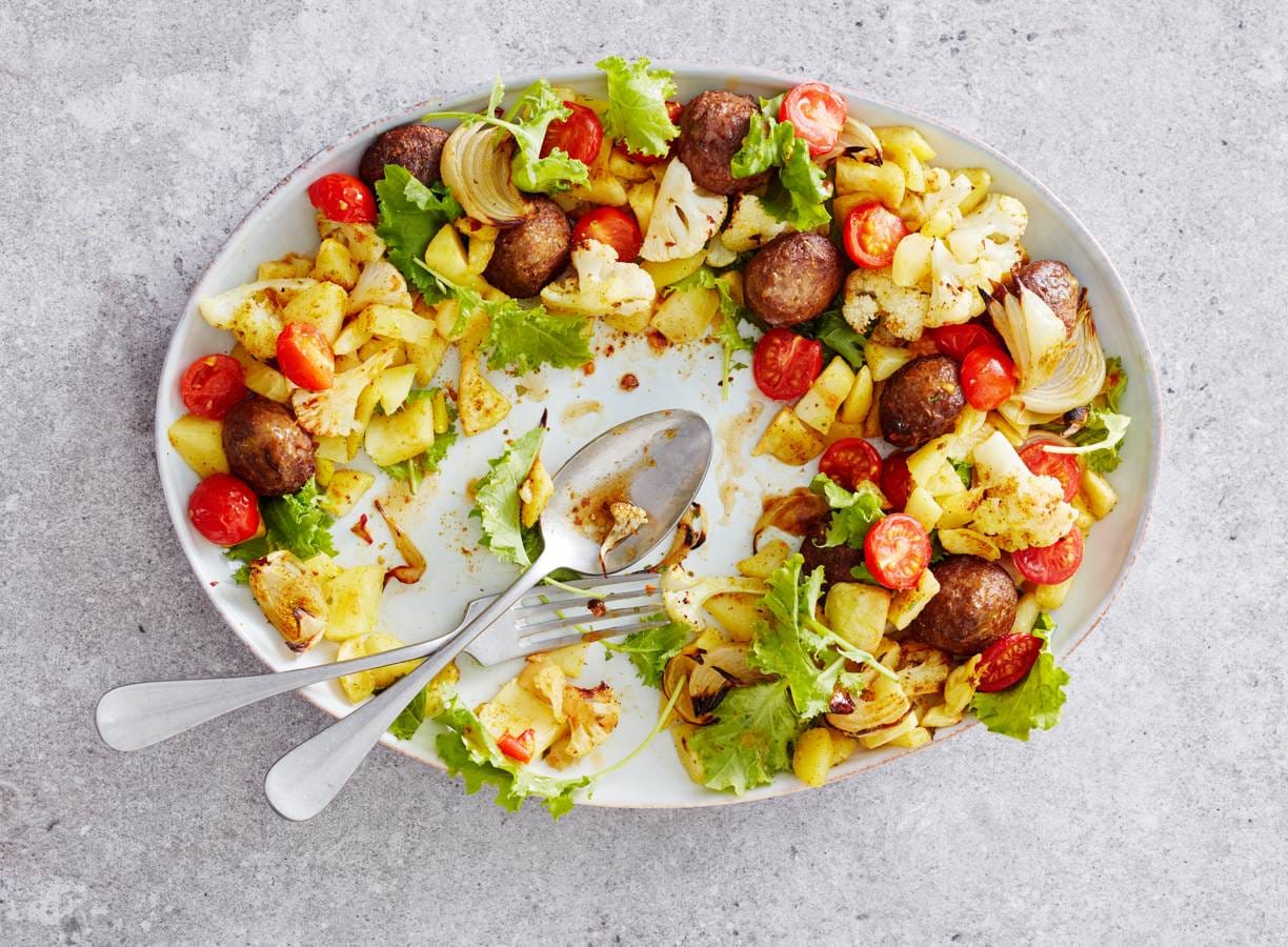 Halveer ondertussen de tomaten. Schep de gehaktballetjes, aardappel en bloemkool na 10 min. oventijd om en voeg de tomaten toe. Neem uit de oven, meng in een schaal de babyboerenkool erdoor en serveer.