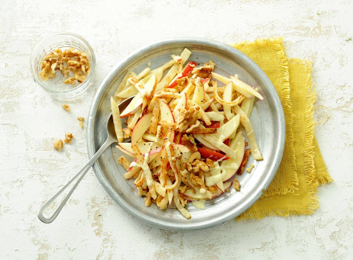 Snijd ondertussen de appels in parten, verwijder het klokhuis en snijd de parten in dunne reepjes (julienne). Meng de yoghurt, mayonaise en mosterd tot een dressing. Breng op smaak met peper en eventueel zout. Hak de walnoten grof. Verdeel de knolselderij, appel en walnoten over een schaal en meng de dressing erdoor.