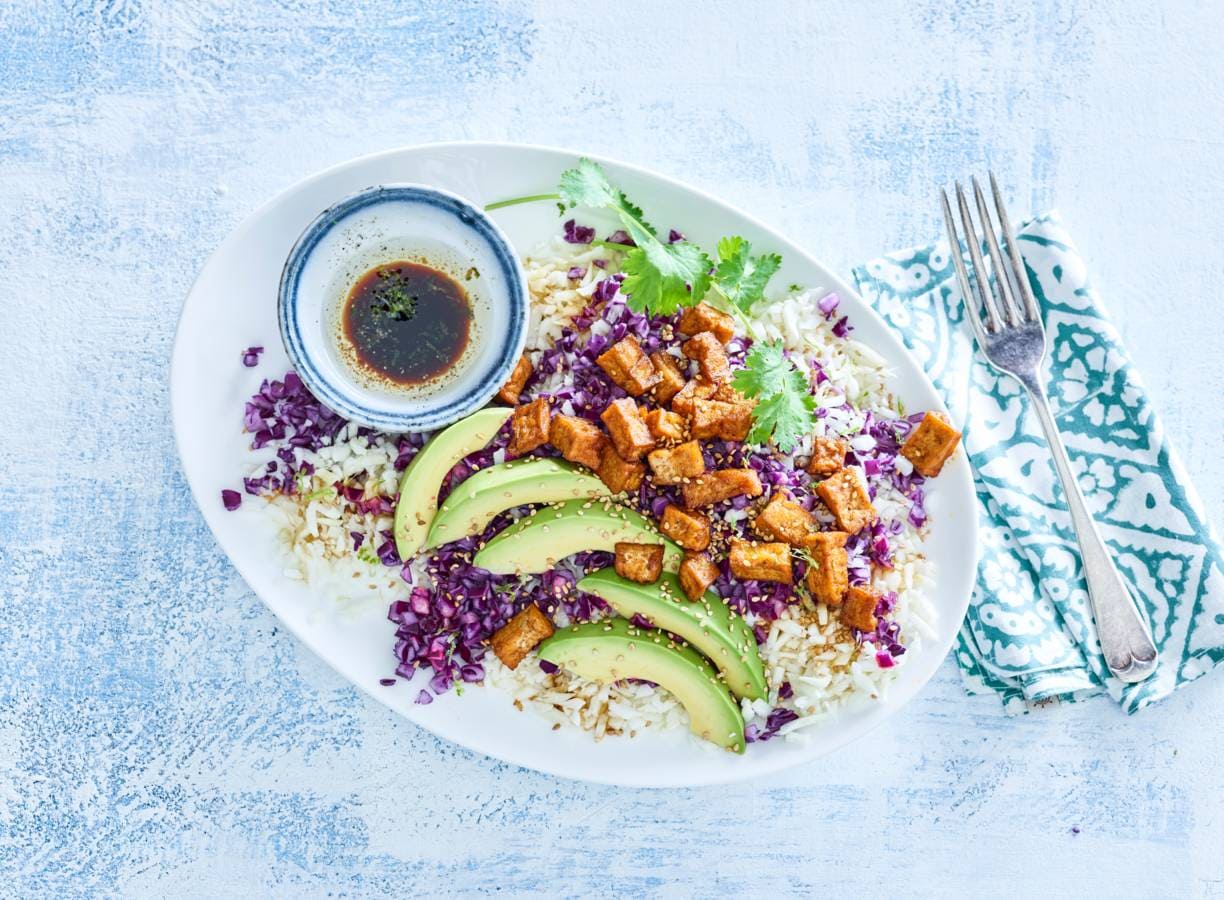 Verdeel de bloemkoolrijst over een grote schaal en bestrooi met de rodekool. Rasp de groene schil van de limoen in een schaaltje, halveer en pers de vrucht uit. Snijd de avocado overlangs doormidden. Verwijder de pit en schep het vruchtvlees met een lepel uit de schil. Snijd in de lengte in plakjes. Besprenkel met wat limoensap en verdeel over de salade.