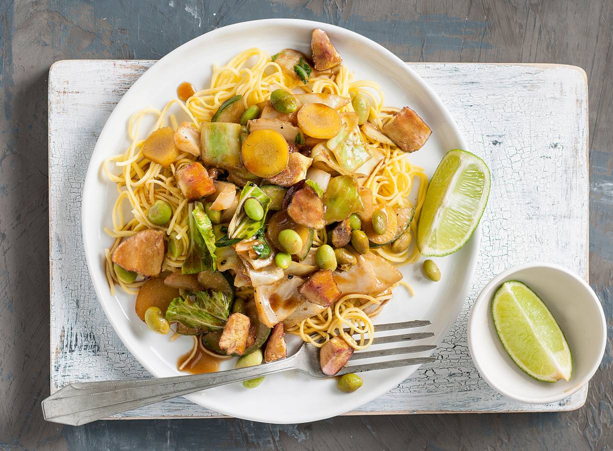Noedels met kalkoen, Aziatische groente en pindadressing
