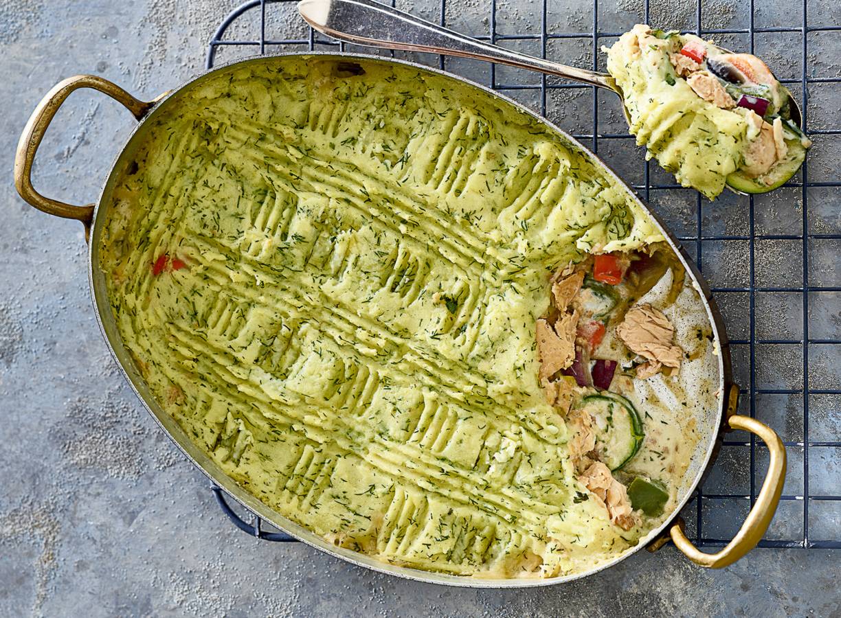 Romige zalmschotel met groente onder een pureedakje