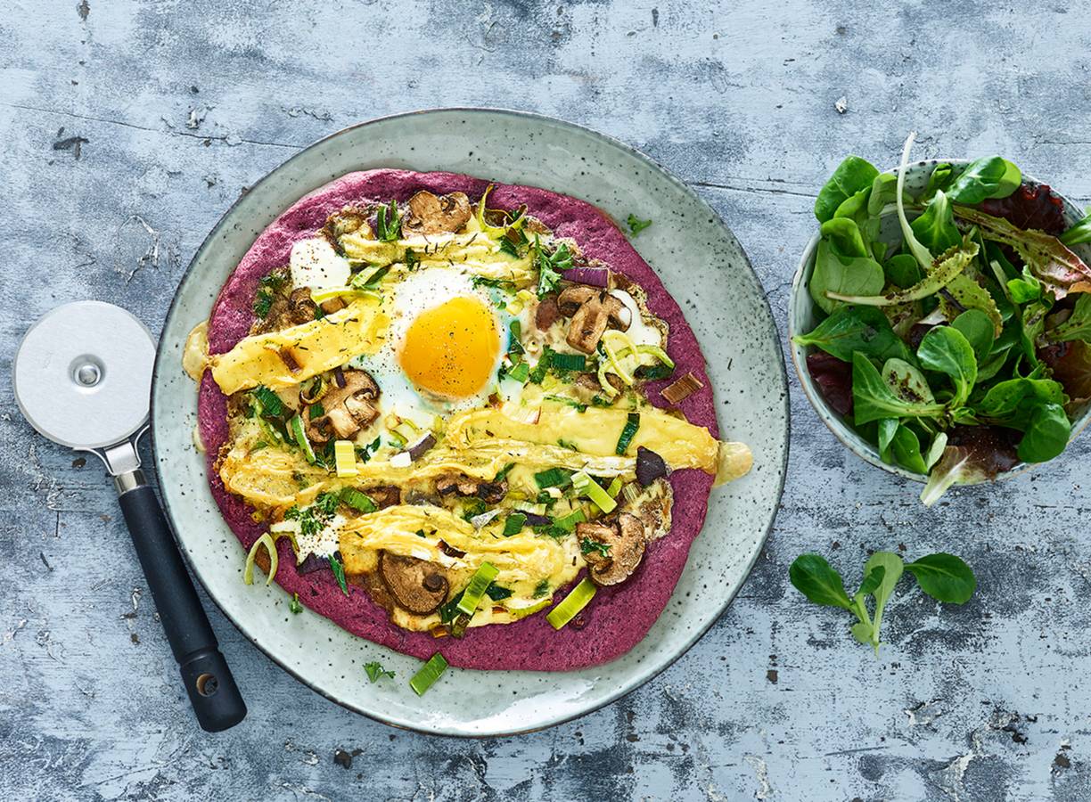 Bietenpizza met paddenstoelen, Franse kaas en gebakken ei
