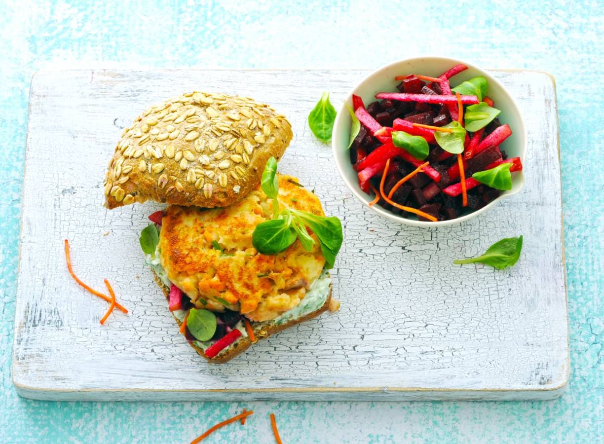 Doe ondertussen de rest van de bieslook met de yoghurt in een hoge beker en pureer met de staafmixer. Boen de appels schoon, halveer en verwijder het klokhuis. Snijd het vruchtvlees in dunne reepjes (julienne). Doe de appel met de bietjes en de veldsla in een kom. Maak een dressing van 1 el citroensap (per 4 personen), de rest van de olie en peper en meng door de salade. Verdeel de yoghurtsaus over de onderste helften van de broodjes en schep er per broodje 1 el salade en een burger op. Serveer de rest van de salade er apart bij. Lekker!