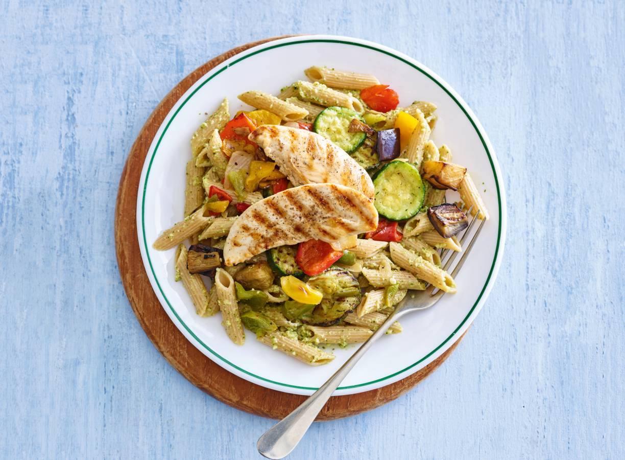 Rasp ondertussen de kaas en doe samen met de walnoten, knoflook, ²/³ van de basilicumblaadjes en de rest van de olie in een hoge beker en pureer met de staafmixer tot een pesto. Breng op smaak met peper en eventueel zout. Giet de pasta af en vang 150 ml kookvocht (per 4 personen) op. Meng het kookvocht en de pesto door de pasta. Verdeel de groente en kip erover. Strooi de rest van het basilicum erover.
