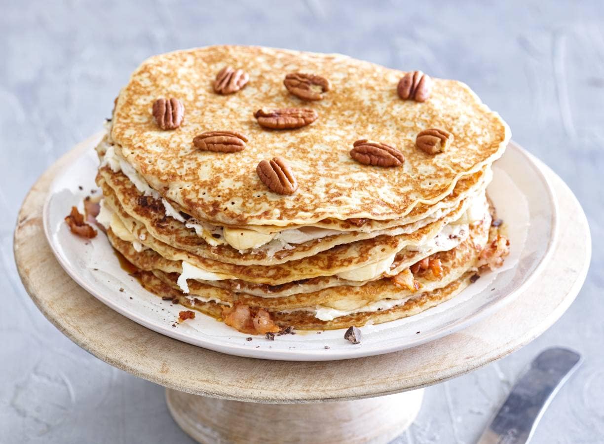 Hak ondertussen de chocolade fijn. Snijd de bananen in plakjes en roer de mascarpone los. Besmeer 1 pannenkoek met ¼ van de mascarpone. Verdeel ¼ van de banaan en ¼ van de chocolade erover. Leg er een pannenkoek op en besprenkel met de keukenstroop en ¹/³ van het spek. Maak zo nog 3 lagen. Verdeel de pecannoten over de pannenkoekentaart.