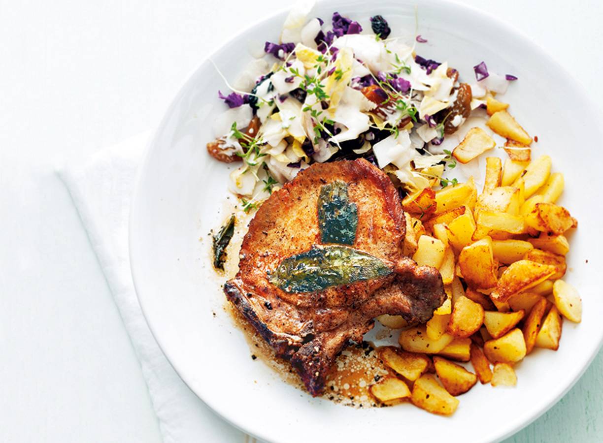 Snijd ondertussen de onderkant van de stronken witlof en snijd het witlof doormidden. Verwijder de harde kern en snijd de blaadjes in stukjes. Meng in een ruime kom met de rodekool, rozijnen en dressing. Breng op smaak met peper en eventueel zout. Serveer de karbonaden met de aardappeltjes en salade.