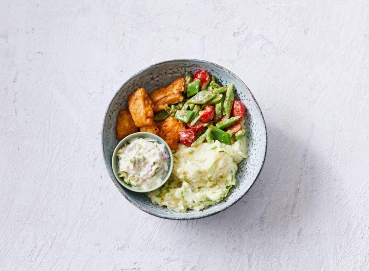 Aardappelpuree met bieslook, snijbonen, kibbeling en ravigottesaus