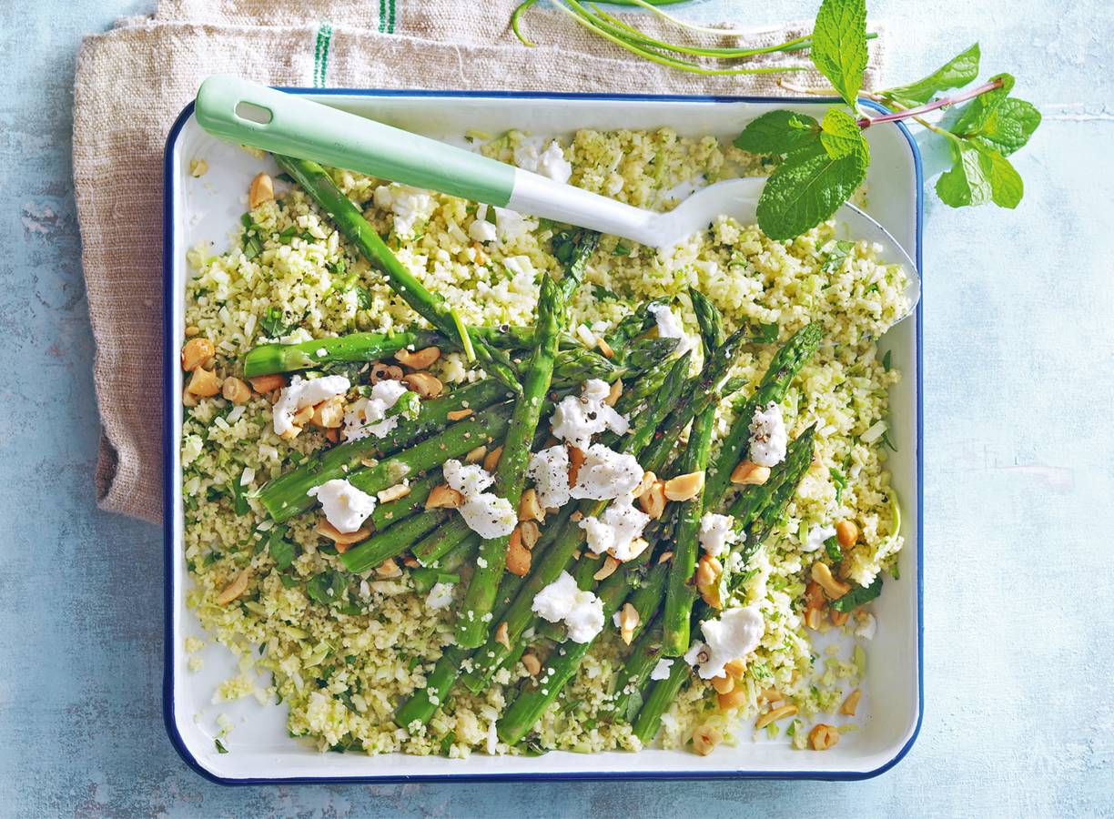 Roer ondertussen de couscous met de broccolirijst los. Schep de munt en bieslook door de couscous en meng de dressing erdoor. Leg de asperges op de kruidencouscous, verkruimel de geitenkaas eroverheen en bestrooi met de cashewnoten.