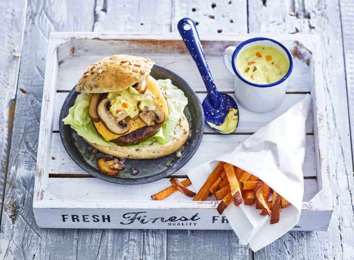 Cheeseburger met champignons & piccalillymayo