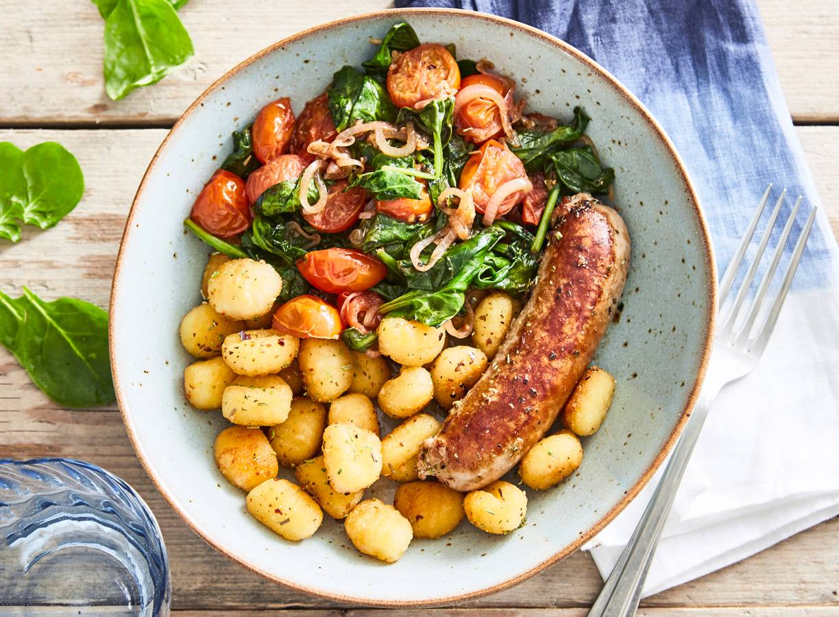 Serveer de venkel-tijmworst met de gebakken gnocchi en de groenten.