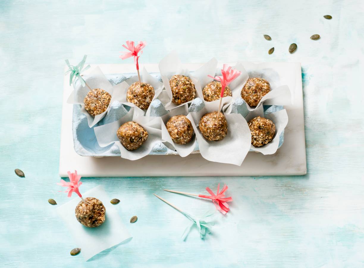 Doe de cashewnoten, pompoenpitten en het chiazaad in de keukenmachine en mix 30 sec. tot de noten en zaden verkruimeld zijn, maar nog niet zo fijn zijn als meel. Voeg de dadels, honing, amandelpasta en kaneel toe en mix tot een kleverige massa. Schep 2 tl van de mix in je hand en rol er een balletje van. Doe dit ook met de rest. Laat de balletjes in 1 uur hard worden in de vriezer en bewaar ze daarna in de koelkast.