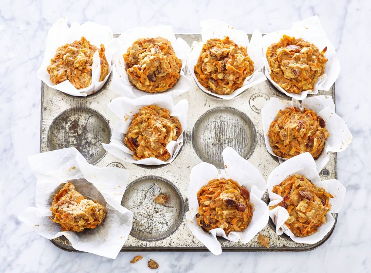 Verwarm de oven voor op 160 °C. Doe de geraspte wortel en appel met alle droge ingrediënten in een grote kom. Smelt de kokosolie in een steelpan en schenk bij de andere ingrediënten in de kom. Voeg de appelmoes, ahornsiroop, honing en amandelmelk toe en meng goed.