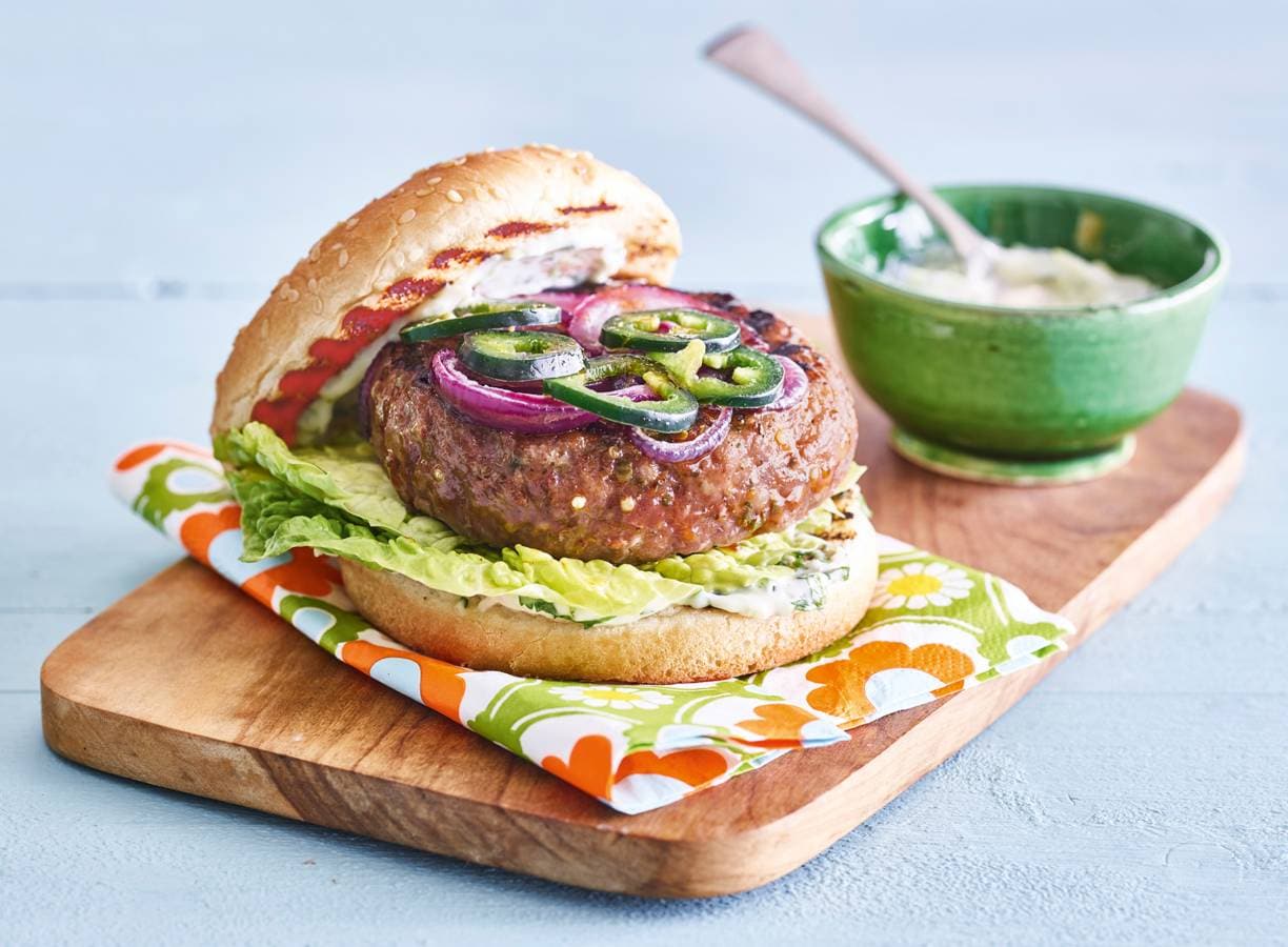 Snijd ondertussen de steelaanzet van de jalapeñopeper, verwijder de zaadlijsten en snijd het vruchtvlees in dunne ringetjes. Rasp de groene schil van de helft van de limoen en pers de hele vrucht uit. Leg de jalapeñopeper in het limoensap. Snijd de koriander fijn en meng met de mayonaise en het limoenrasp. Besmeer de snijkanten van de broodjes met de koriandermayonaise. Verdeel over de onderste helft van de broodjes de sla, burger, ui en peperringetjes. Dek af met de bovenkant van de broodjes.