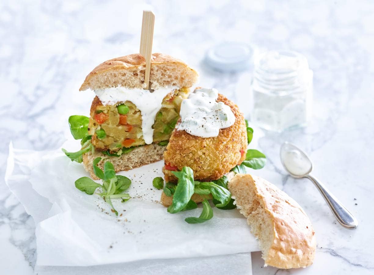 Een burger van wel 4 soorten groente op een lekkere bol met tzatziki: dat is écht lekker.