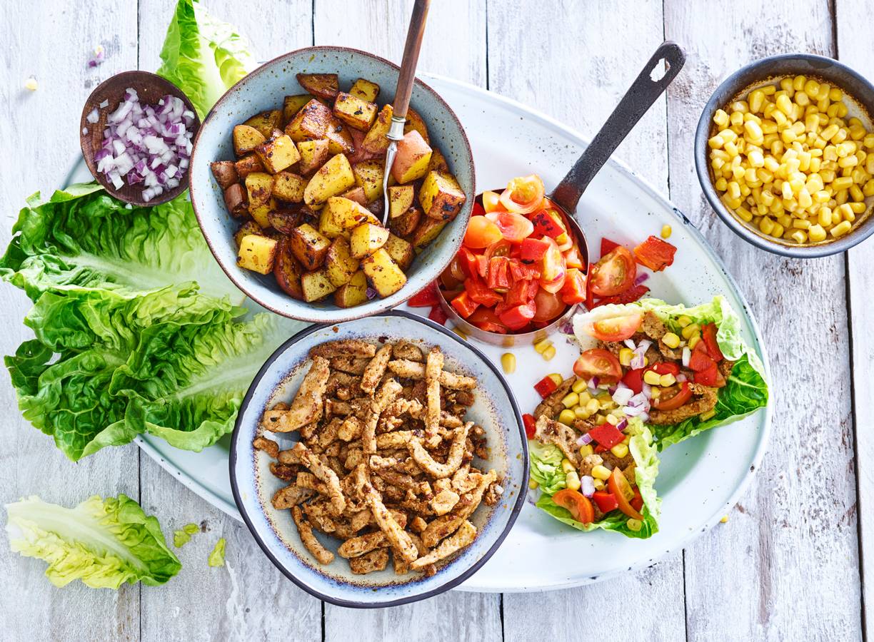 Serveer de aardappelen, shoarma, salsa, mais en sla in aparte schalen op tafel. Zo kan iedereen zijn eigen slawrap vullen.