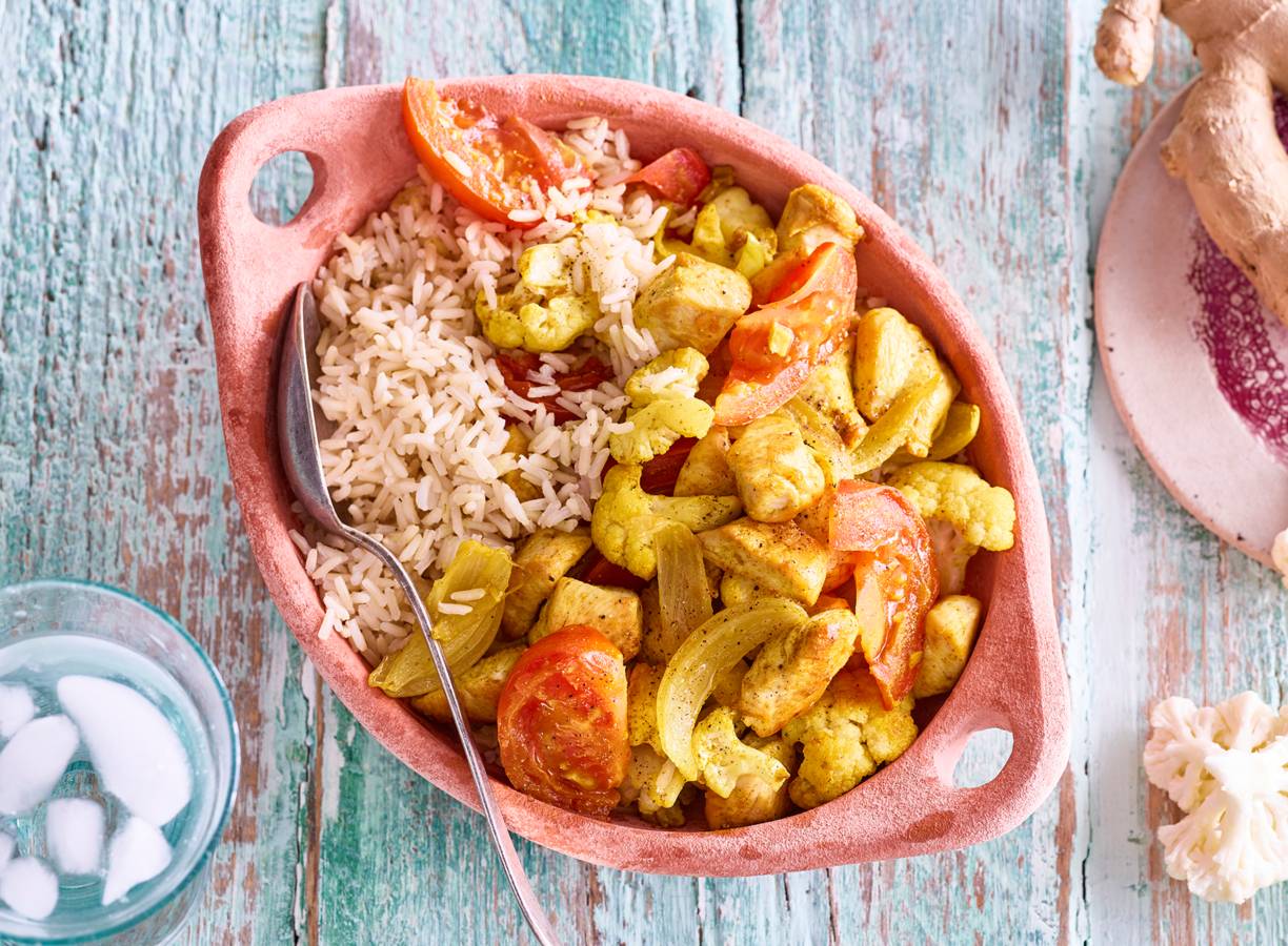 Verhit de olie in de wok en fruit de ui, knoflook, gember en kerriepoeder 3 min. op laag vuur. Voeg de kipblokjes toe en bak 1 min. op hoog vuur. Voeg de bloemkoolroosjes toe en bak 6 min. mee.