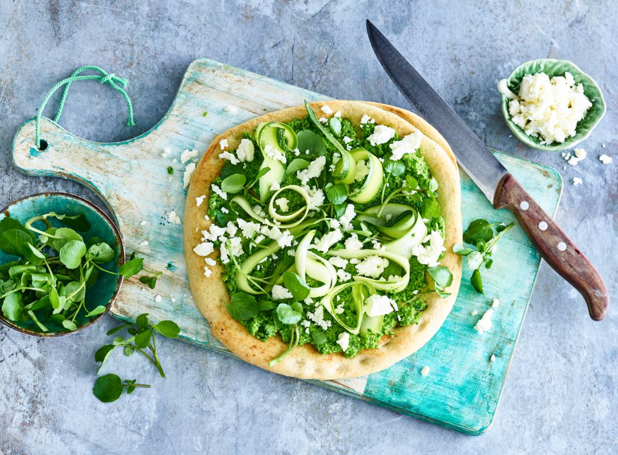 Neem de bodems uit de oven en verdeel de erwtenspread, courgetteroosjes, de rest van de waterkers en de feta erover.