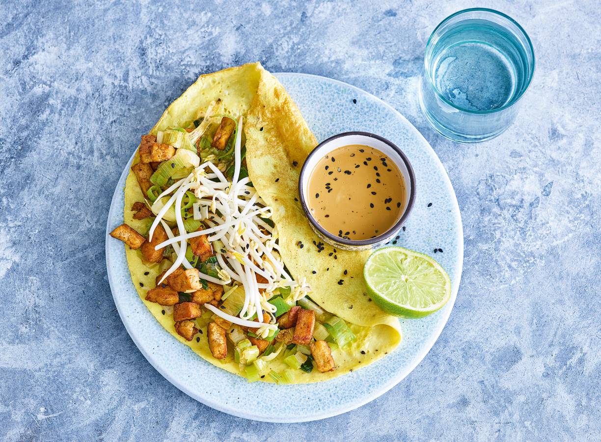 Omelet met pittige roerbakreepjes en soja-mayodressing