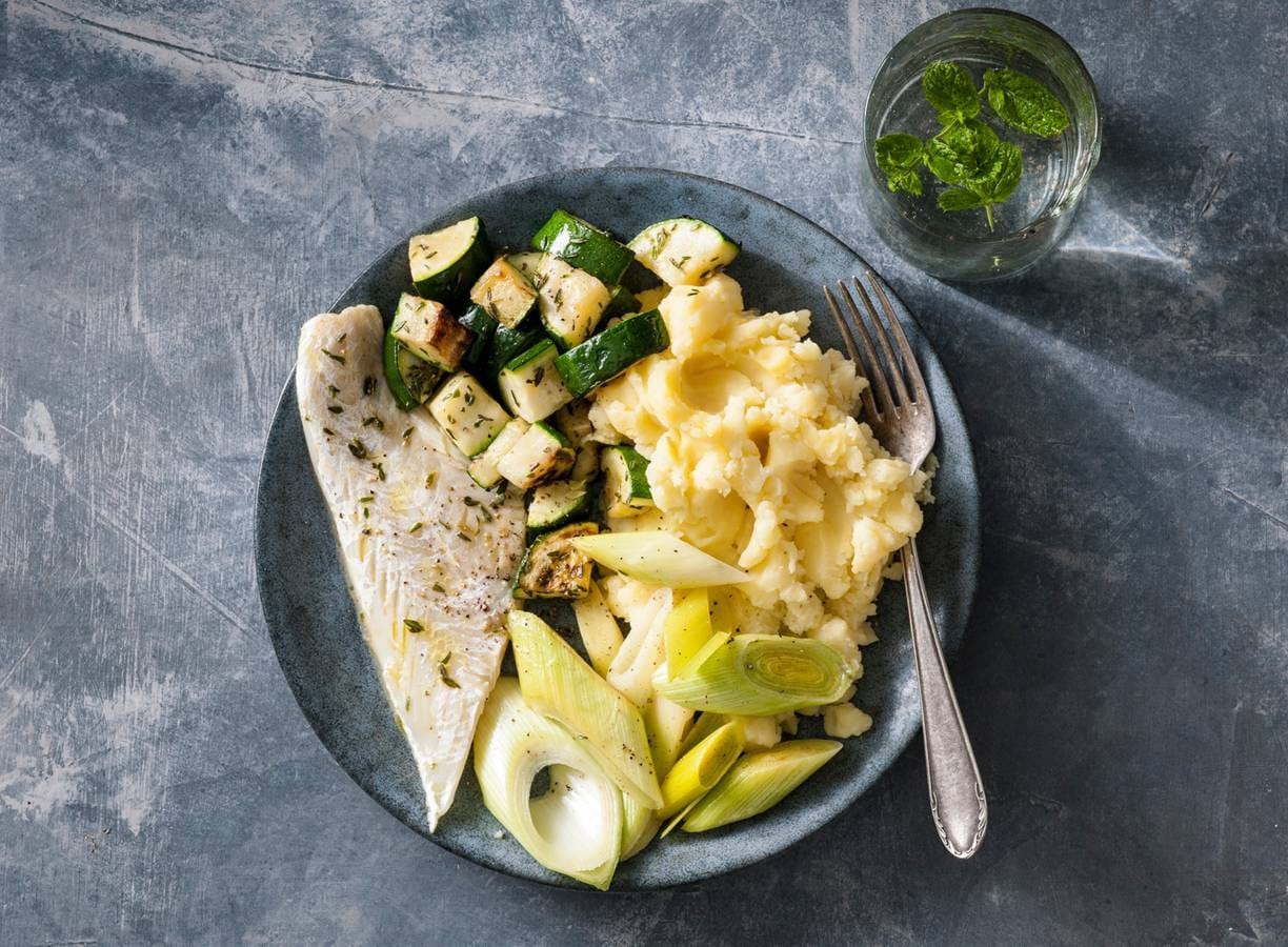Verdeel de puree, gestoofde prei, courgette en schelvis in componenten over de borden.