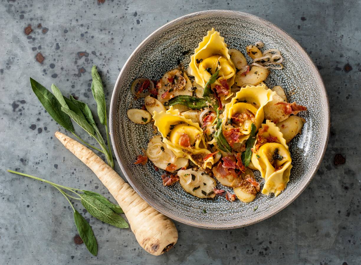 Verse pompoentortelloni met pastinaak en pancetta