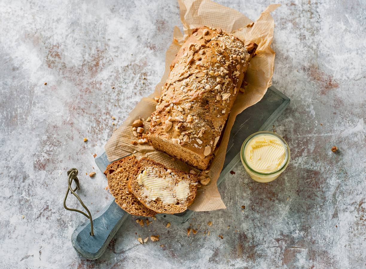 Bak de cake in het midden van de oven in ca. 35 min goudbruin en gaar. Controleer na 30 min. met een satéprikker op gaarheid Komt deze er schoon uit, dan is de cake gaar. Laat minimaal 1 uur afkoelen. Snijd in plakken en besmeer met de boter. Serveer de rest van de honing erbij.