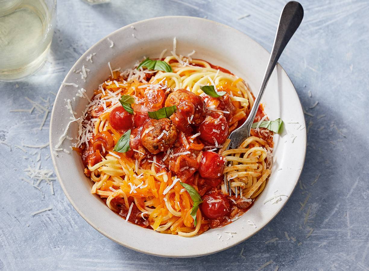 Pompoenspaghetti met kipgehaktballetjes en Parmezaanse kaas