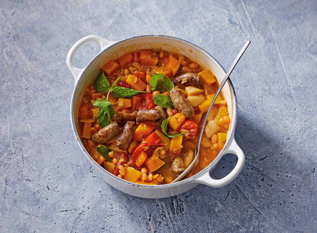 Pom, pom, pom...poen! De ultieme herfstgroente in een stoof met witte bonen en chipolata.