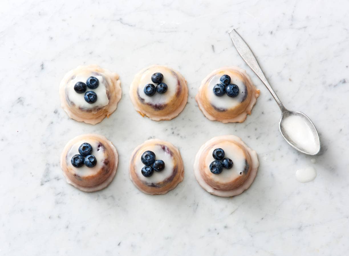 Schep het beslag in de vormpjes en verdeel er ⅔ van de blauwe bessen over: druk ze iets naar beneden zodat ze in het beslag wegzakken. De reden dat we dit doen (in plaats van de bessen door het beslag te mengen) is dat elk cakeje zo evenveel bessen bevat. Bak de cakejes 30 min. tot de randen goudbruin zijn en een in het midden erin gestoken satéprikker er schoon uitkomt. Laat de cakejes 10 min. in de vorm afkoelen voor je ze omgekeerd op een rooster zet. Zet opzij om de cakejes volledig koud te laten worden.