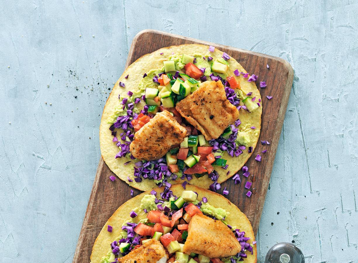 Verdeel de wraps over de borden. Besmeer met de avocado en verdeel achtereenvolgens de rodekool, tomaten-komkommersalsa en vis erover.